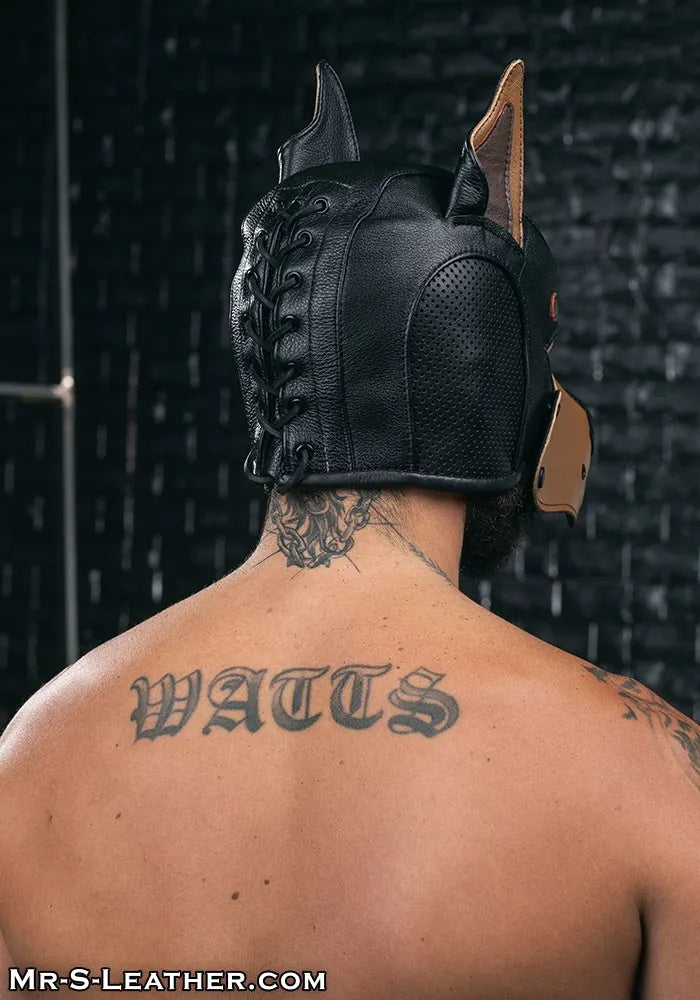 Serious puppies will love this hood for its open chin design that lets you chew on all the bone you want, while not squashing any longer beards and facial hair. The sides are built with a perforated leather to keep a pup cool when they're moshing, and so they won't miss a single command from their handler. Eyelets and a leather cord let you lace the back of this hood up as tight or as loose as you need it.