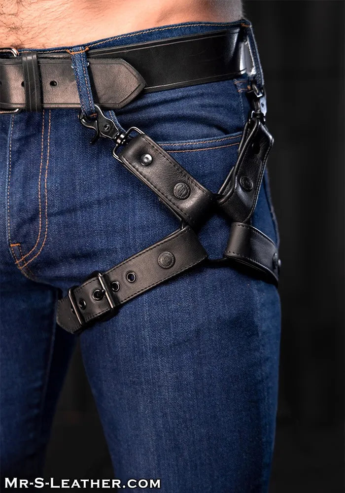 A classic accessory to match with the rest of your piped gear or as a stand-alone piece to flag your kinky side. Two layers of garment leather and black hardware accent your thighs and draw attention to your crotch. Best worn over skin-tight jeans and with a pair of hot boots.