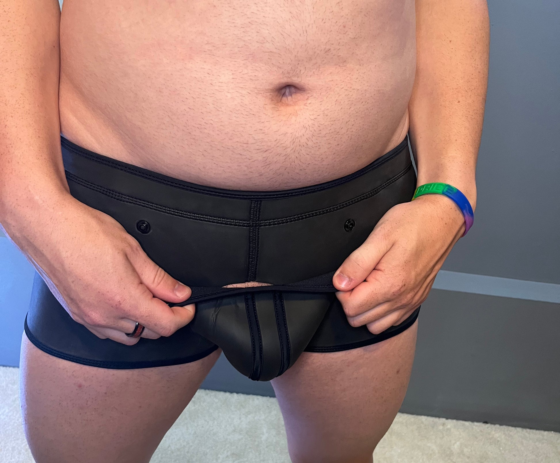 These all black Neoprene Boxers have a back-zip and removable codpiece - making you a full access pig.